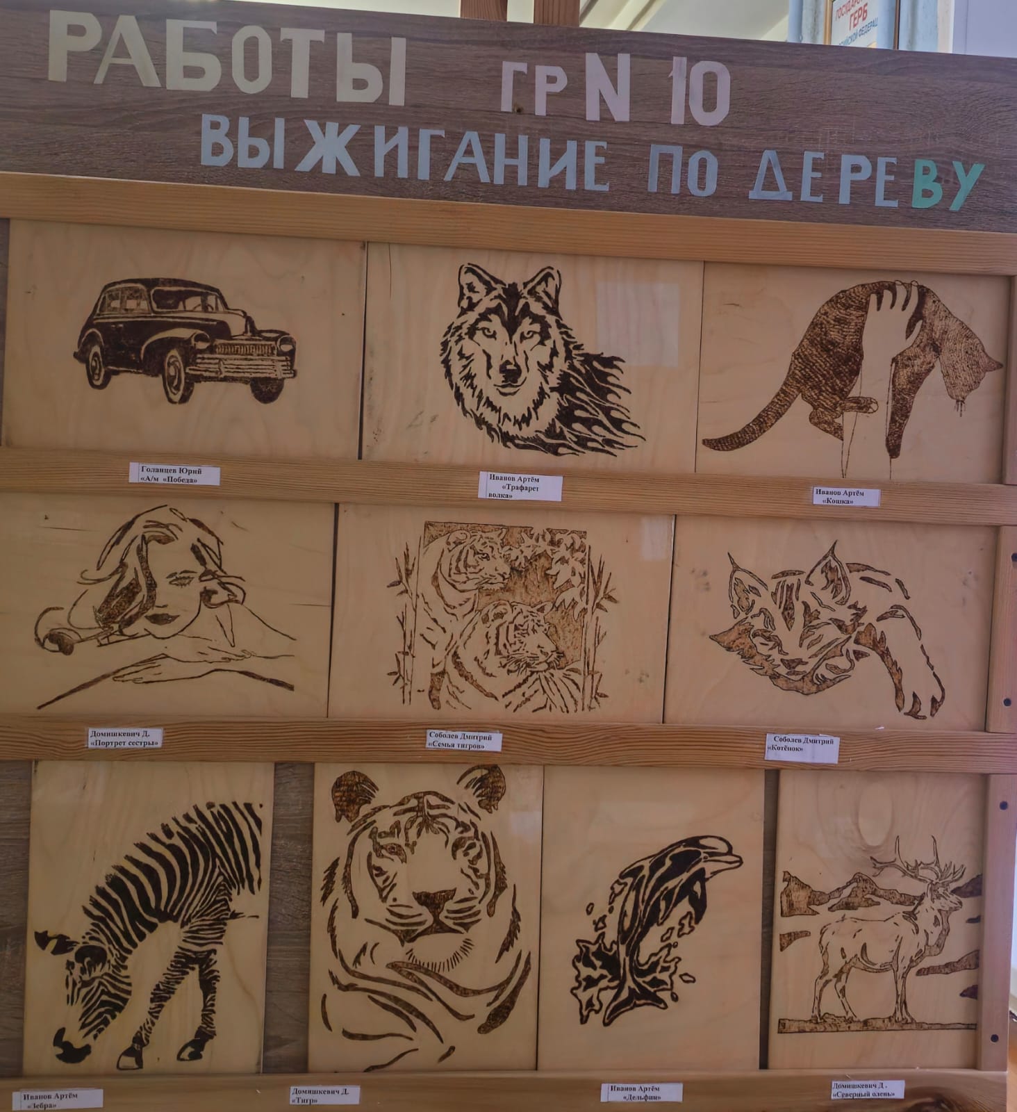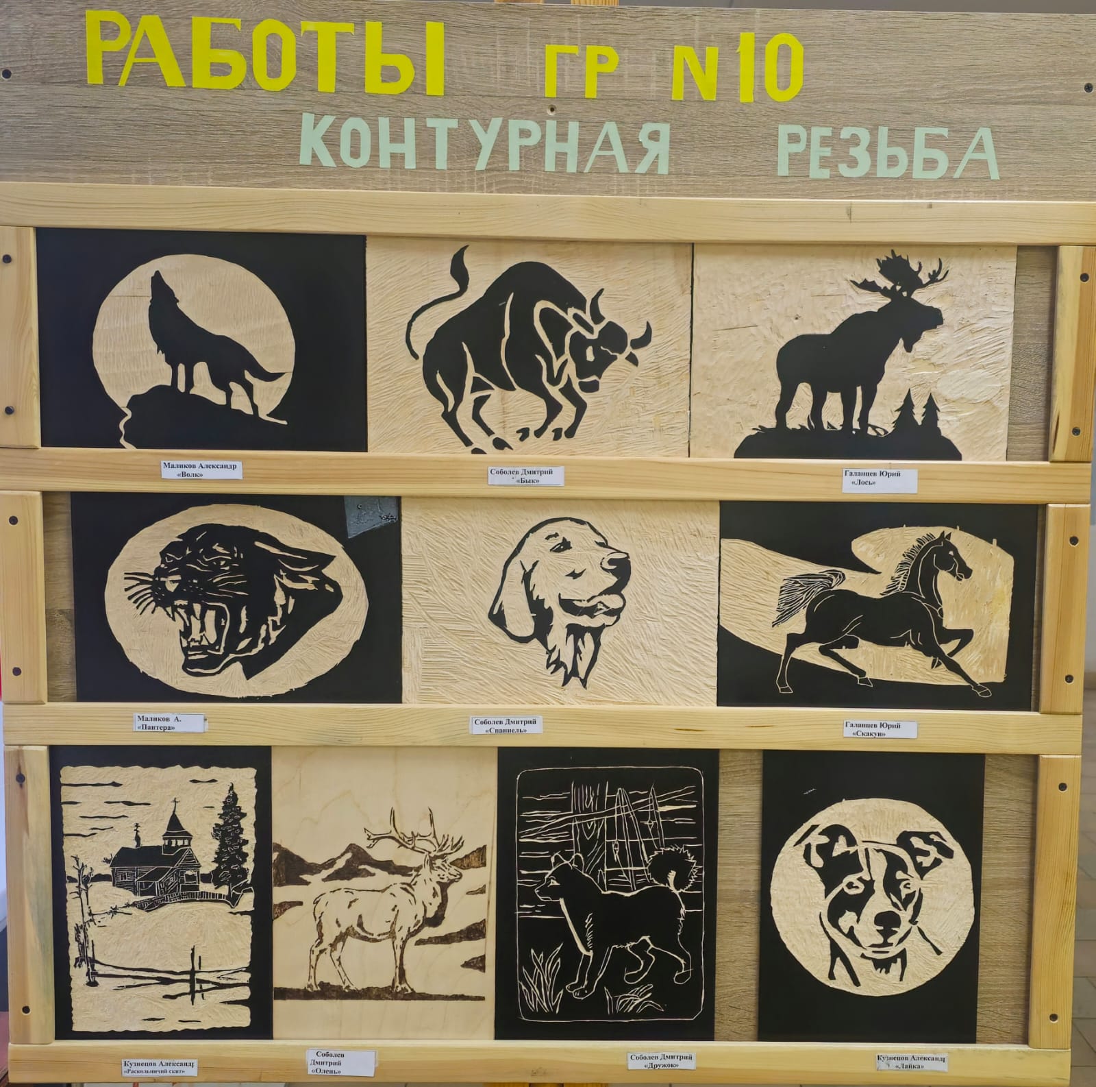 Работы обучающихся нашего отделения: контурная резьба и выжигание по дереву.