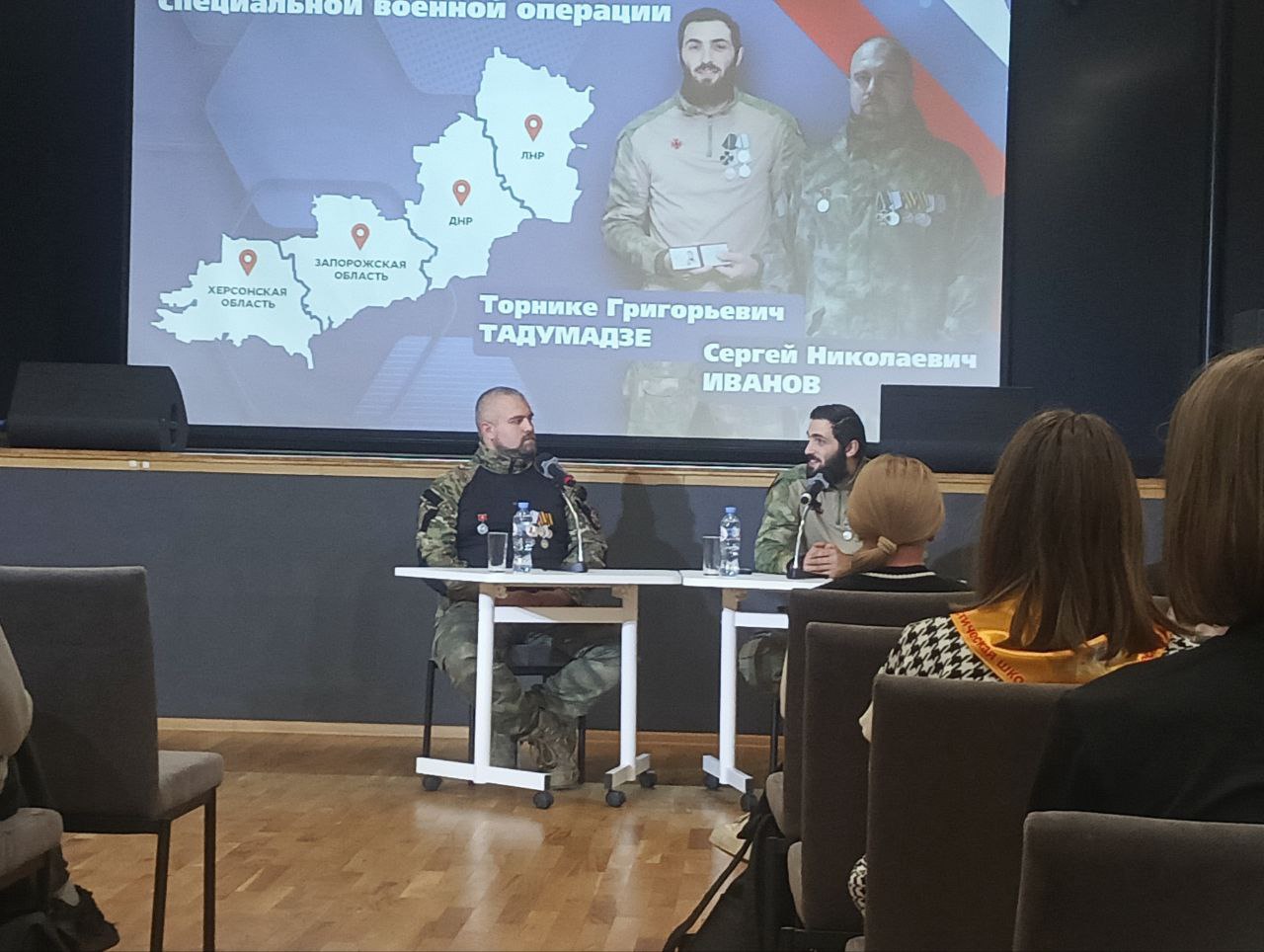 30 сентября 2025 года в молодежном пространстве «Развитие» состоялась встреча студентов с молодыми участниками специальной военной операции Сергеем Николаевичем Ивановым и Торнике Григорьевичем Тадумадзе, принимавшими участие в освобождении Донбасса и Новороссии. Мероприятие приурочено к памятной дате – объединению новых регионов (ЛНР, ДНР, Херсонской и Запорожской областей) с Российской Федерацией. Воссоединение стало возможным только благодаря мужеству, стойкости и героизму наших воинов - участников специальной военной операции. Именно они, с оружием в руках , защищая интересы страны и наших братьев на этих землях , проложили дорогу домой для миллионов соотечественников. Они - настоящие защитники Отечества, продолжатели дела наших великих предков, которые веками собирали и обороняли русские земли.