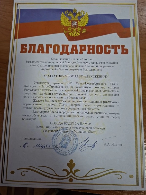 Сегодня 31.03.2026 г. наш колледж передал представителям Народного движения Ангелы Тыла (vk.com/angelitila) в г. Санкт-Петербурге специальные моноколеса, которые изготовили в сварочных мастерских колледжа студенты групп 019 и 018, под руководством мастеров п/о Вербицкого Р.И., Биричевской В.Б., Рязанцева В.И., в рамках совместного проекта, который направлен на поддержку наших военнослужащих и обеспечение их необходимыми средствами для оказания медицинской помощи. Эти устройства смогут помочь медицинским санитарным батальонам и группам эвакуации в выносе пострадавших, будут обеспечивать быструю и безопасную транспортировку раненых, что, безусловно, спасет множество жизней и существенно упростит работу медицинских служб.
